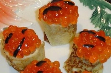Блинные рулетики с творожным сыром и икрой