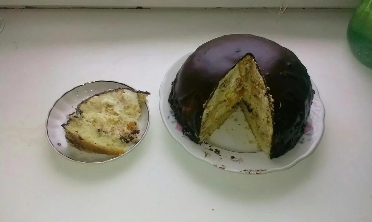 ШАГ 12 Готовую пирамидку обернуть тонким пластом свежеприготовленного, еще теплого бисквита (толщина бисквита должна быть не больше 1 см, готовить такой бисквит удобно на большом противне, застеленным пергаментом и смазанным маслом). Завернуть елочку в пищевую пленку и убрать в холодильник на несколько часов (за это время бисквит успеет принять нужную форму).