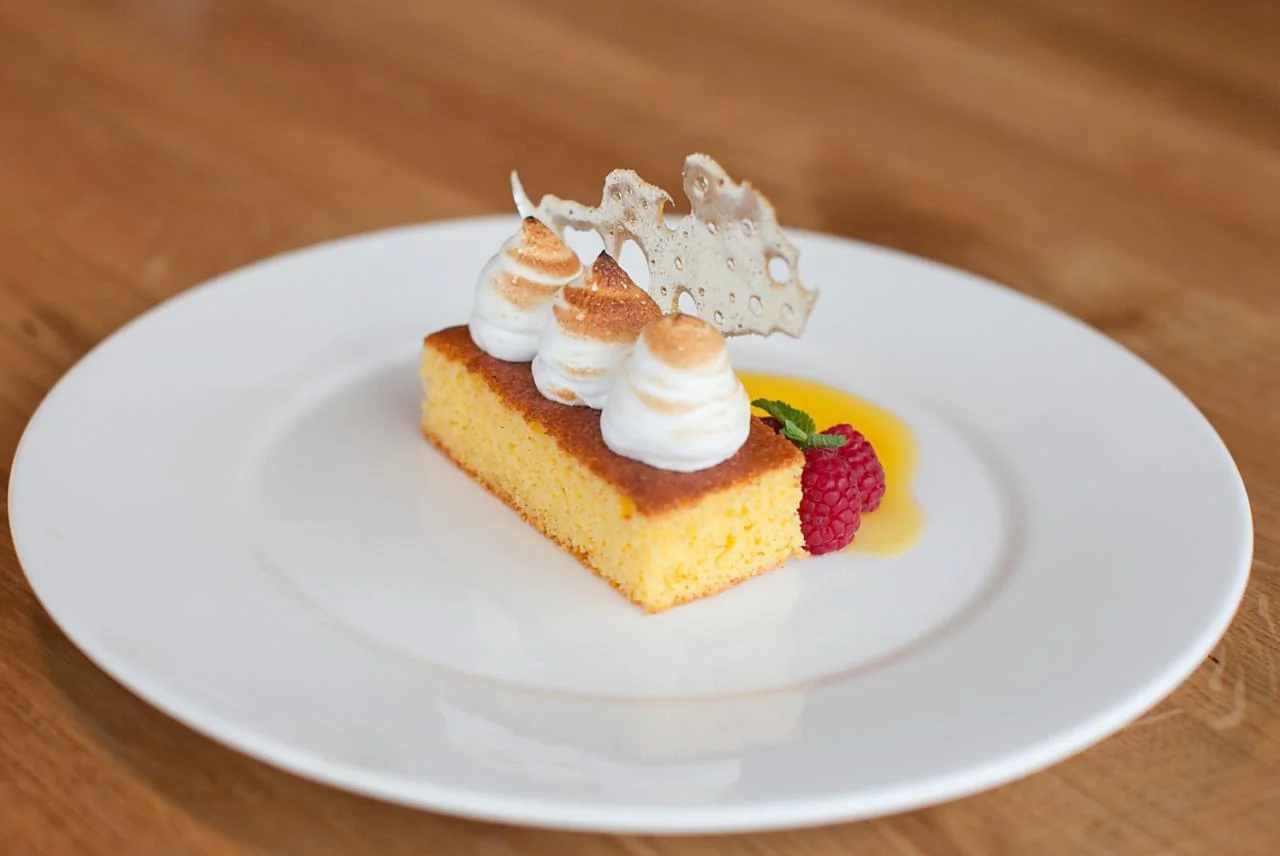 ШАГ 9 Вылить на тарелку 1 столовую ложку апельсинового соуса, положить кусочек пропитанного ромовым сиропом кекса, сверху украсить меренгой при помощи кондитерского мешочка и опалить верхушку полученного десерта газовой горелкой. Подавать со свежими ягодами, листьями мяты и карамельным декором.