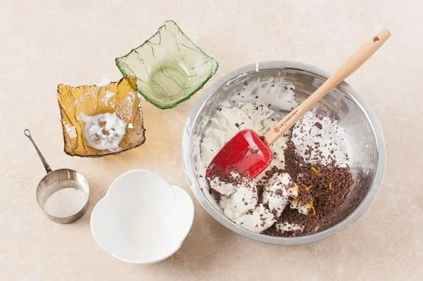 ШАГ 5 Взбейте сливки, смешайте их с рикоттой, тертым шоколадом, соком и цедрой апельсина, взбейте венчиком до загустения.
