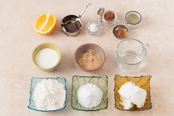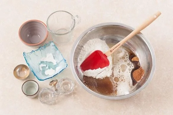 ШАГ 1 Смешайте муку, какао, разрыхлитель, сахар, корицу, 20 мл подсолнечного масла и 60 мл воды.