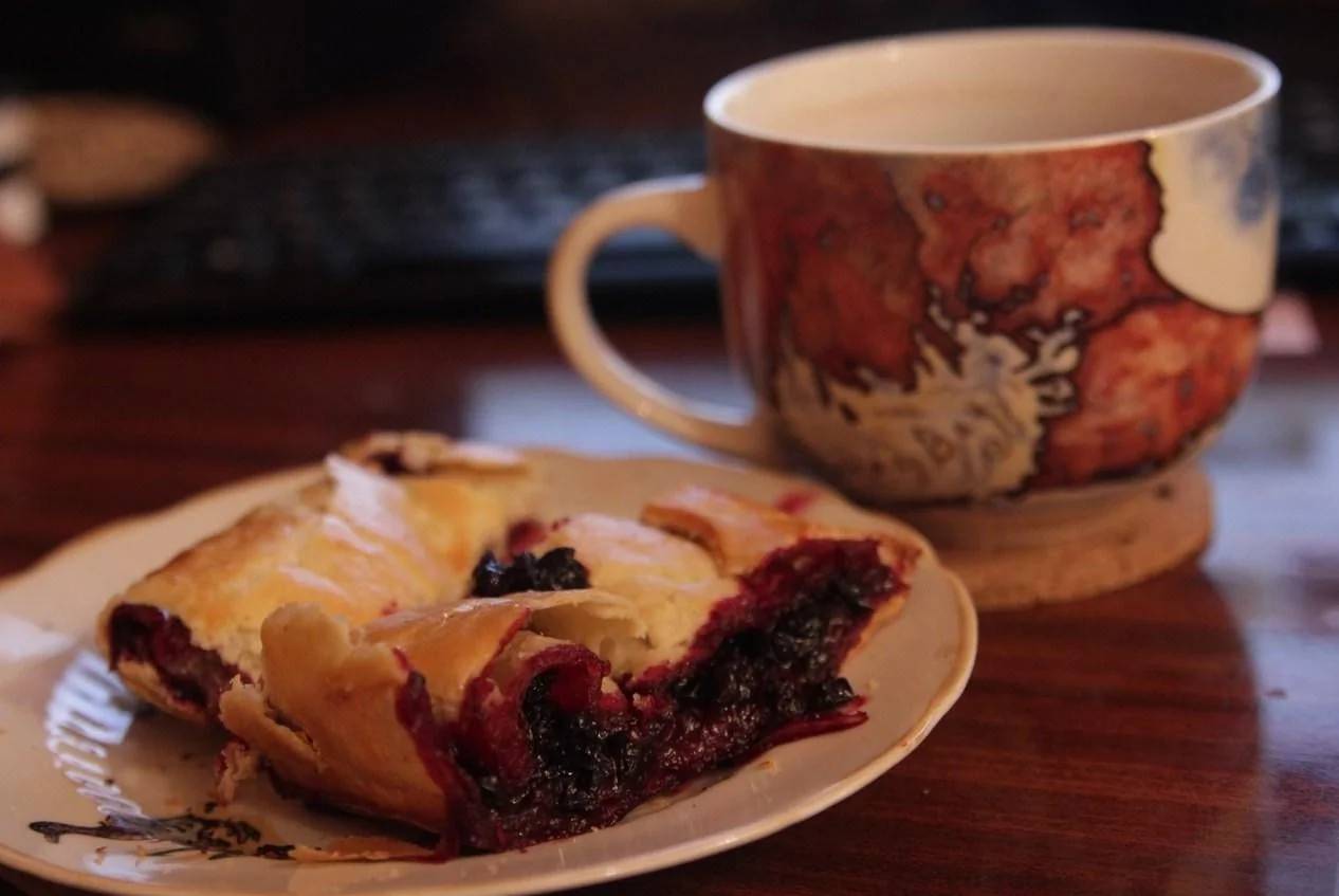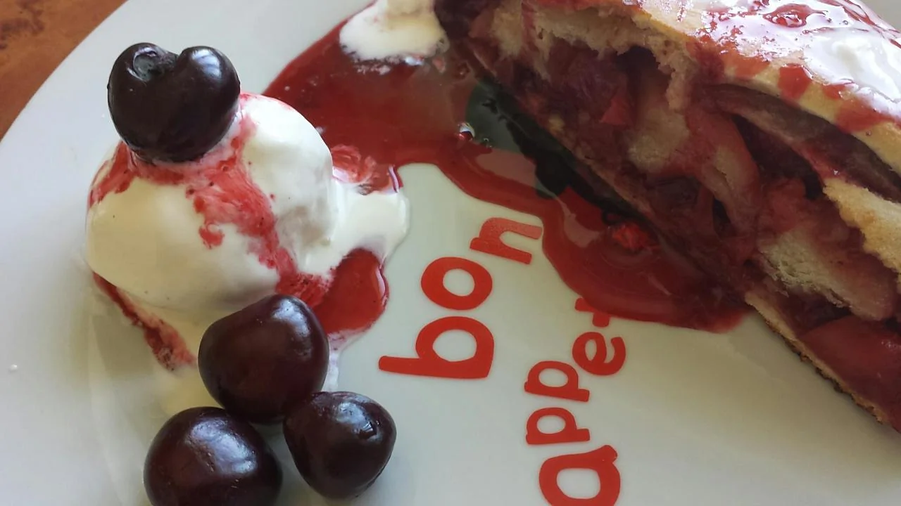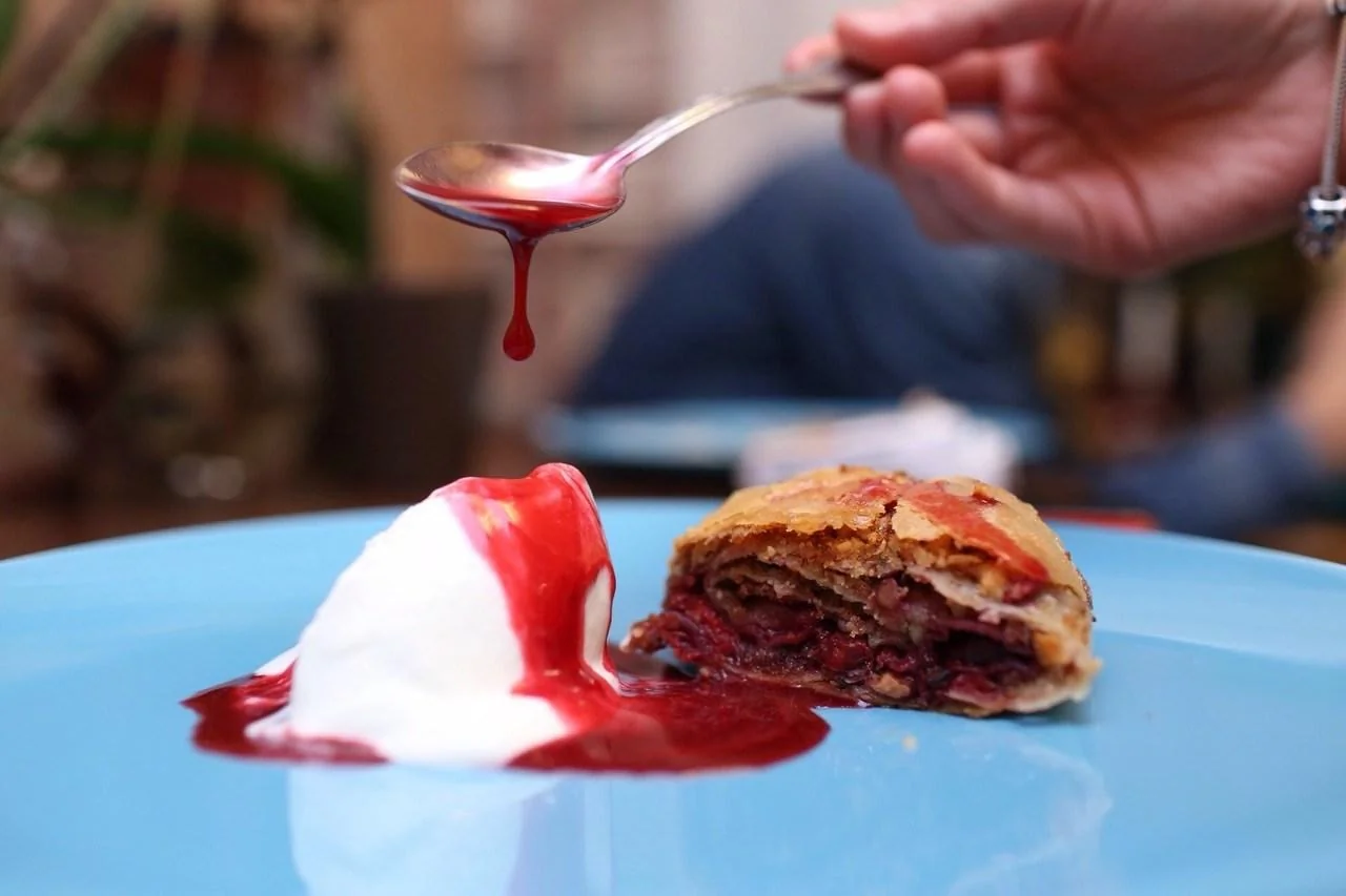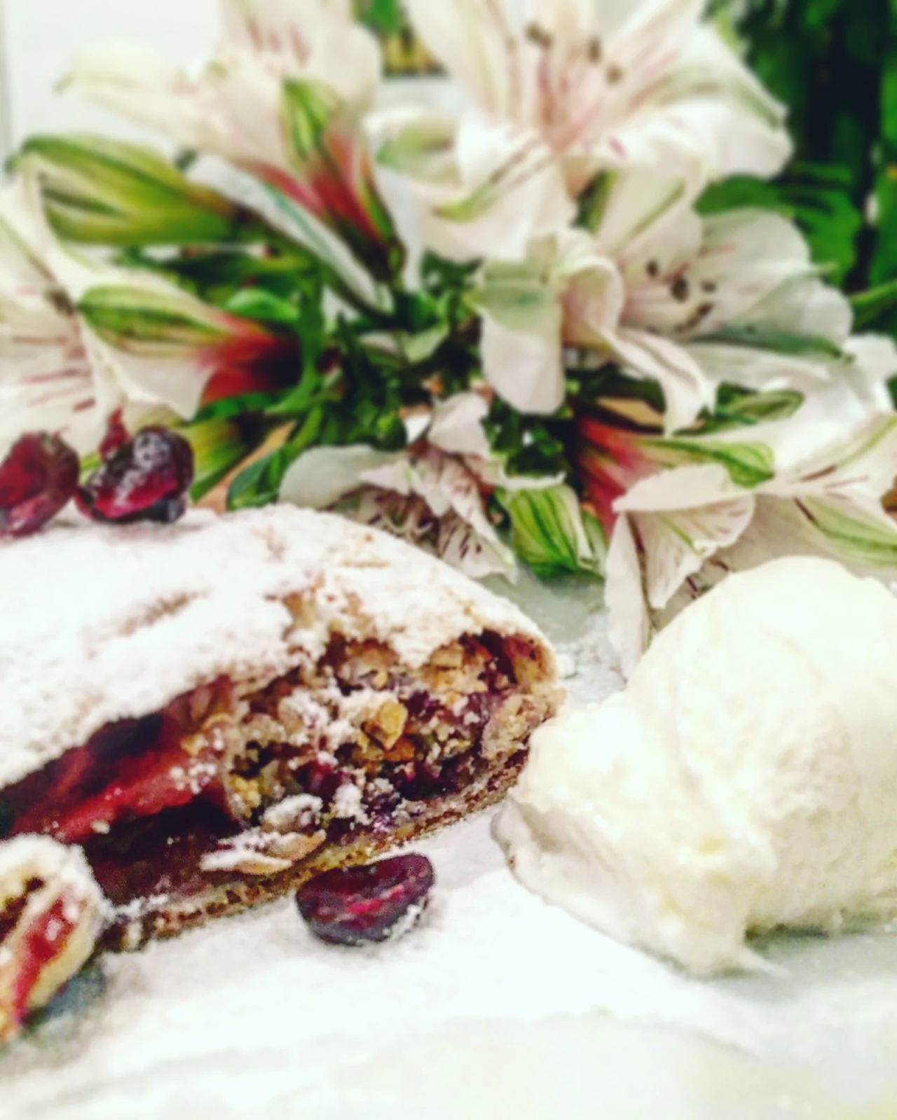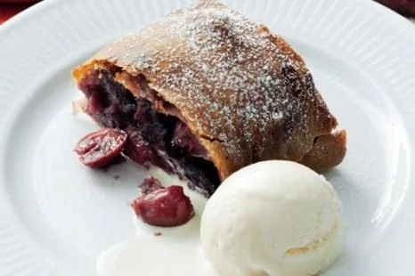 ШАГ 10 Подавайте штрудель с шариком мороженного, присыпав сахарной пудрой на вишневом соусе.