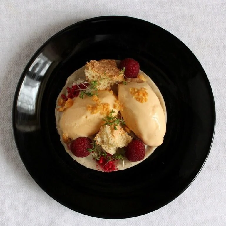ШАГ 5 Для сервировки поставьте в центр тарелки кулинарное кольцо и выложите в него немного ванильного пюре. Сформируйте из готового мороженого кнели и положите их сверху. Рядом разместите кусочки бисквита, кнели посыпьте карамелизованным хлебом. Украсьте десерт малиной и кресс-салатом.