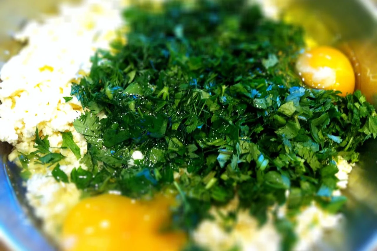 ШАГ 3 Сыр натереть, вмешать в массу 2 яйца, рубленную зелень, добавить перец (соль — на любителя).