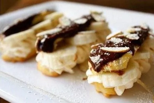 ШАГ 5 Выложить дольки банана на порционную тарелку, полив карамелью и теплым шоколадом.