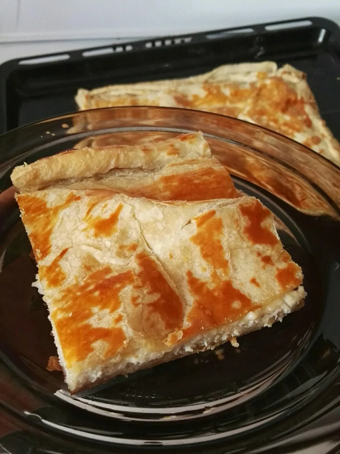 ШАГ 5 На смазанный маслом противень положить первый пласт теста, разложить начинку, посыпать тертым сыром и накрыть вторым пластом, прищепить кончики и смазать верх пирога желтком.
