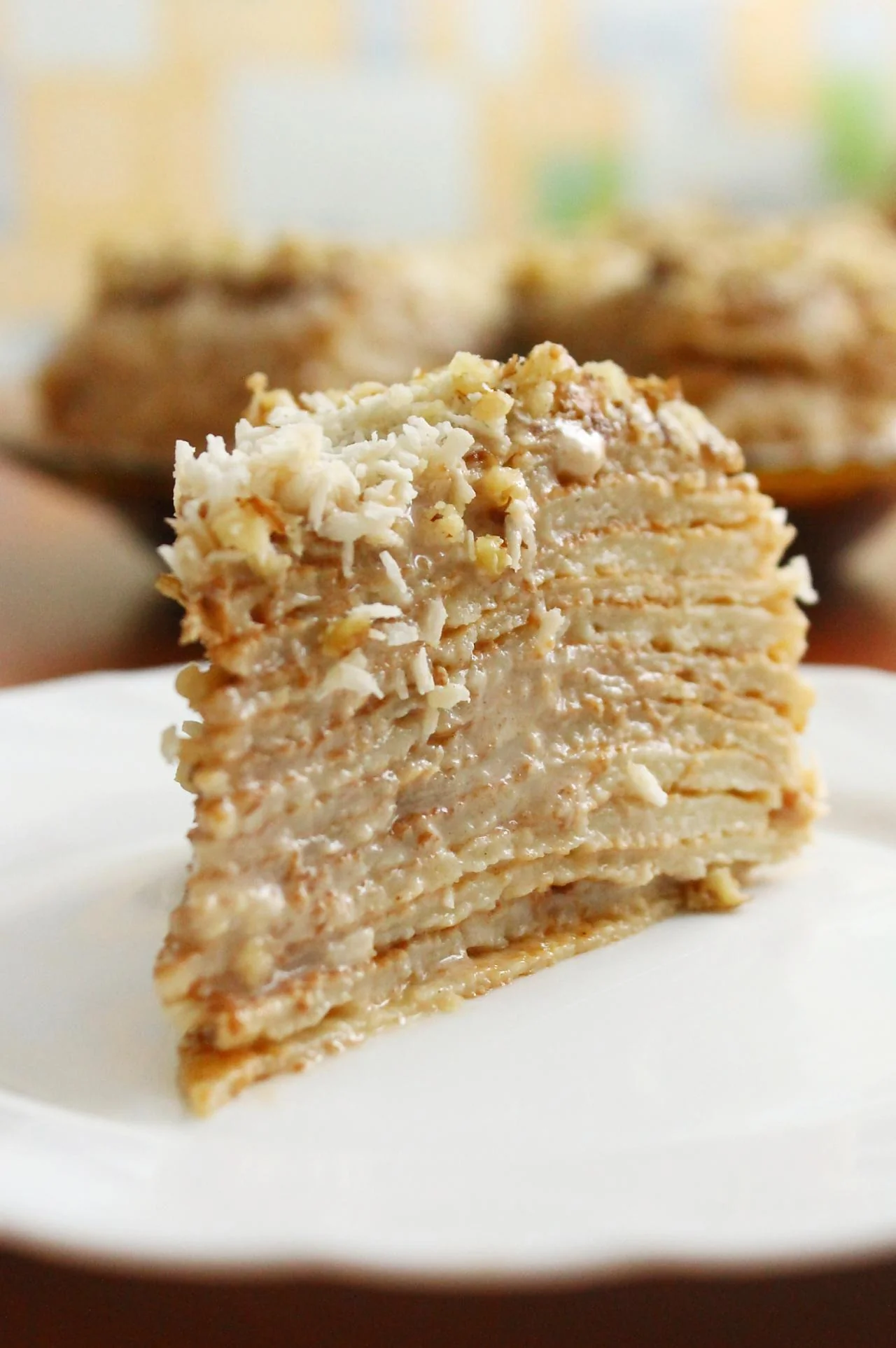 ШАГ 8 Достаем из холодильника крем, промазываем блины. Украшаем торт на свой вкус.