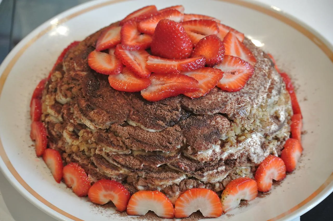 ШАГ 7 Выдержать в холодильнике не менее 3-х часов (рекомендую поставить на ночь). Затем перевернуть на блюдо, снять пленку. Украсить дольками клубники и тертым шоколадом.