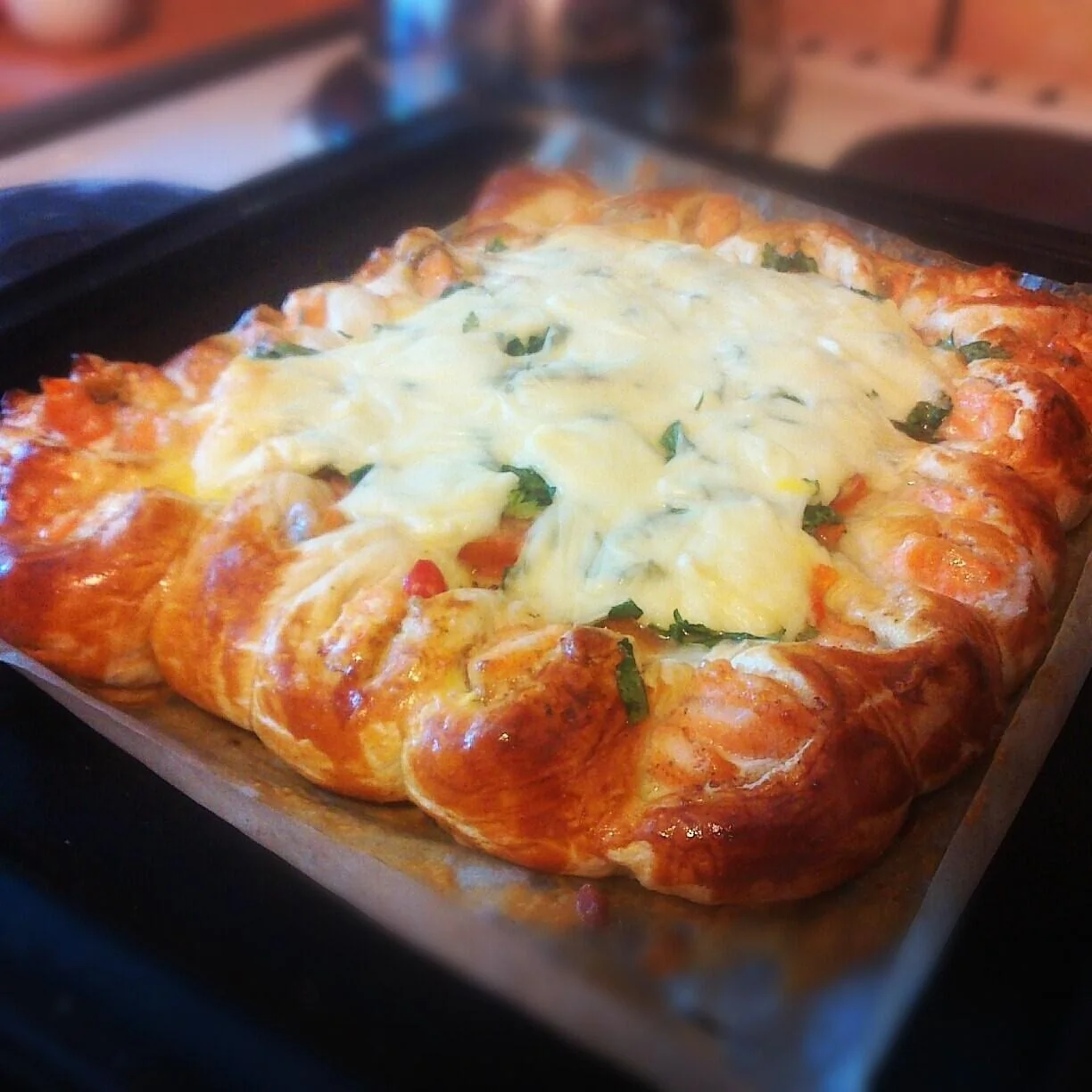 Красивый пирог с семгой и моцареллой