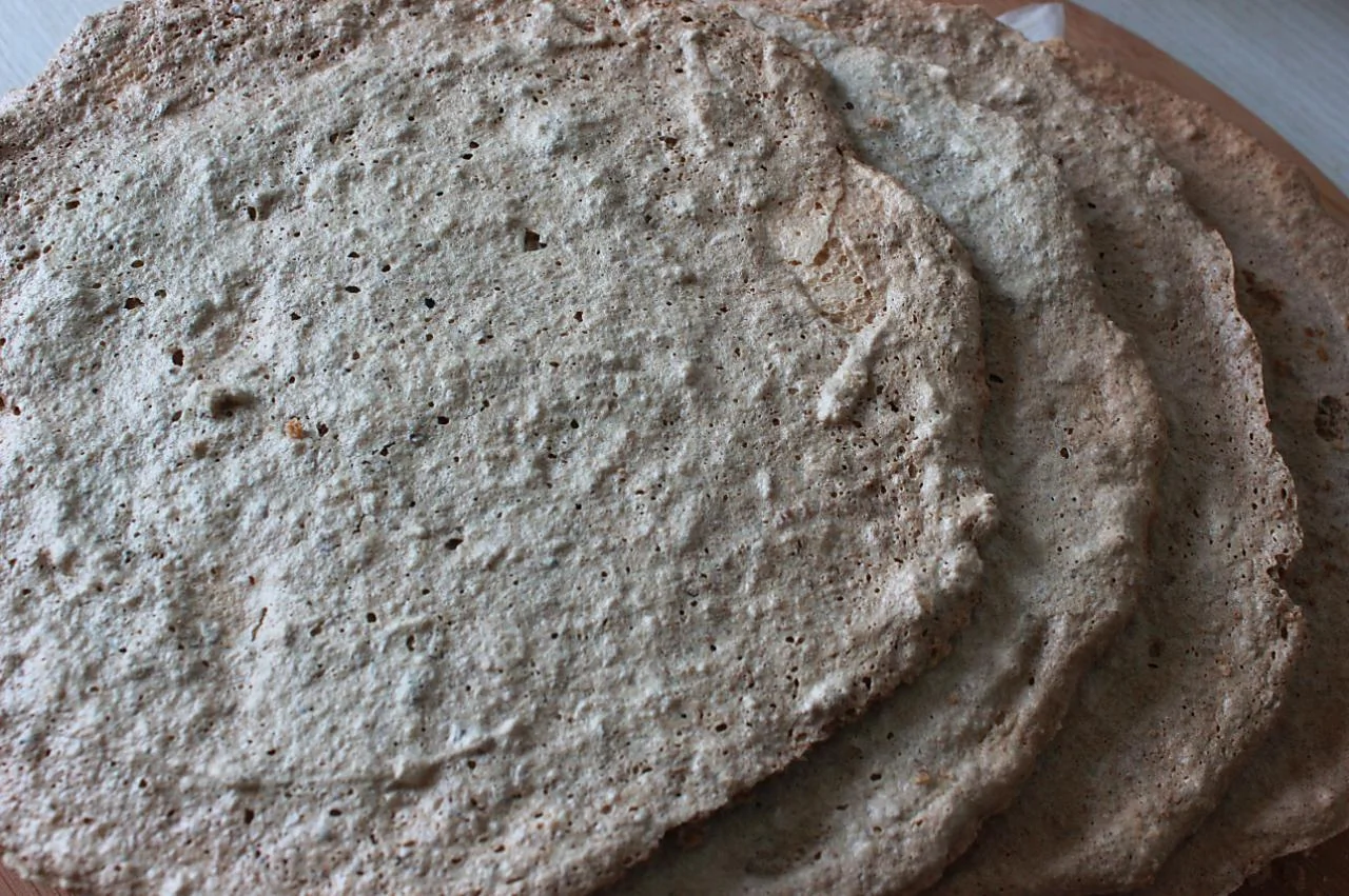 ШАГ 2 Нарисовать на пергаменте круги нужного диаметра, ровным слоем нанести тесто. Выпекать при 160 градусах до светло-коричневого цвета (40–50 минут). Остудить на решетке. (Коржи пекла в два приема, тесто делала из 4 белков и пекла 3 коржа).