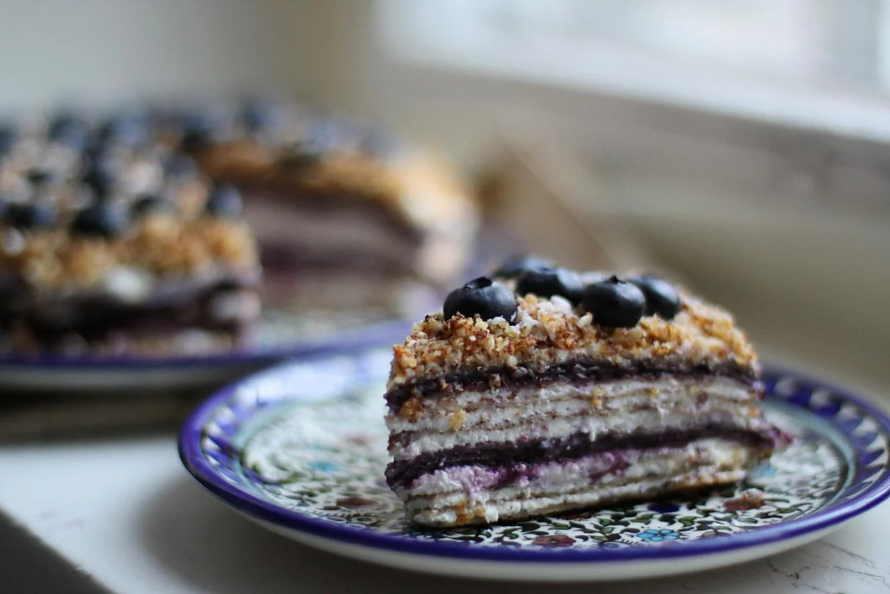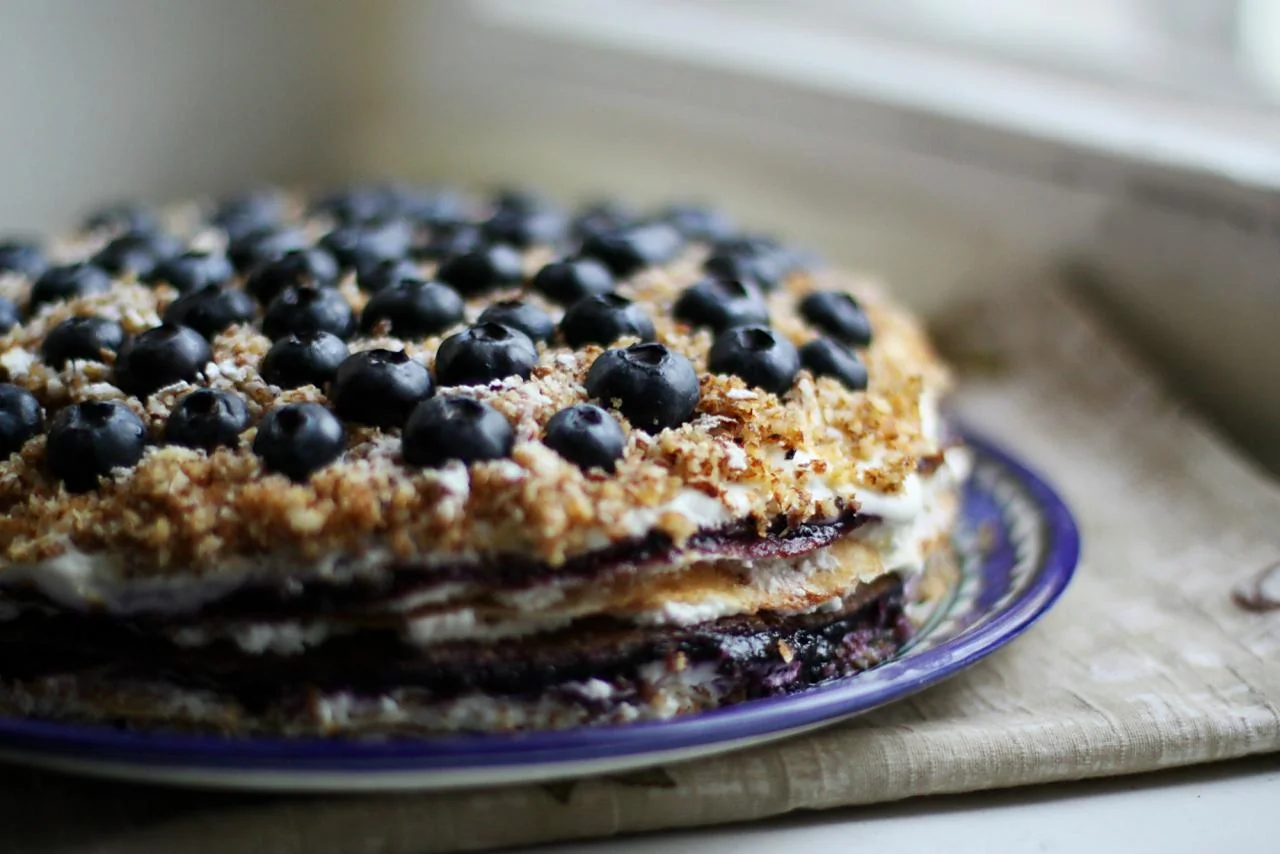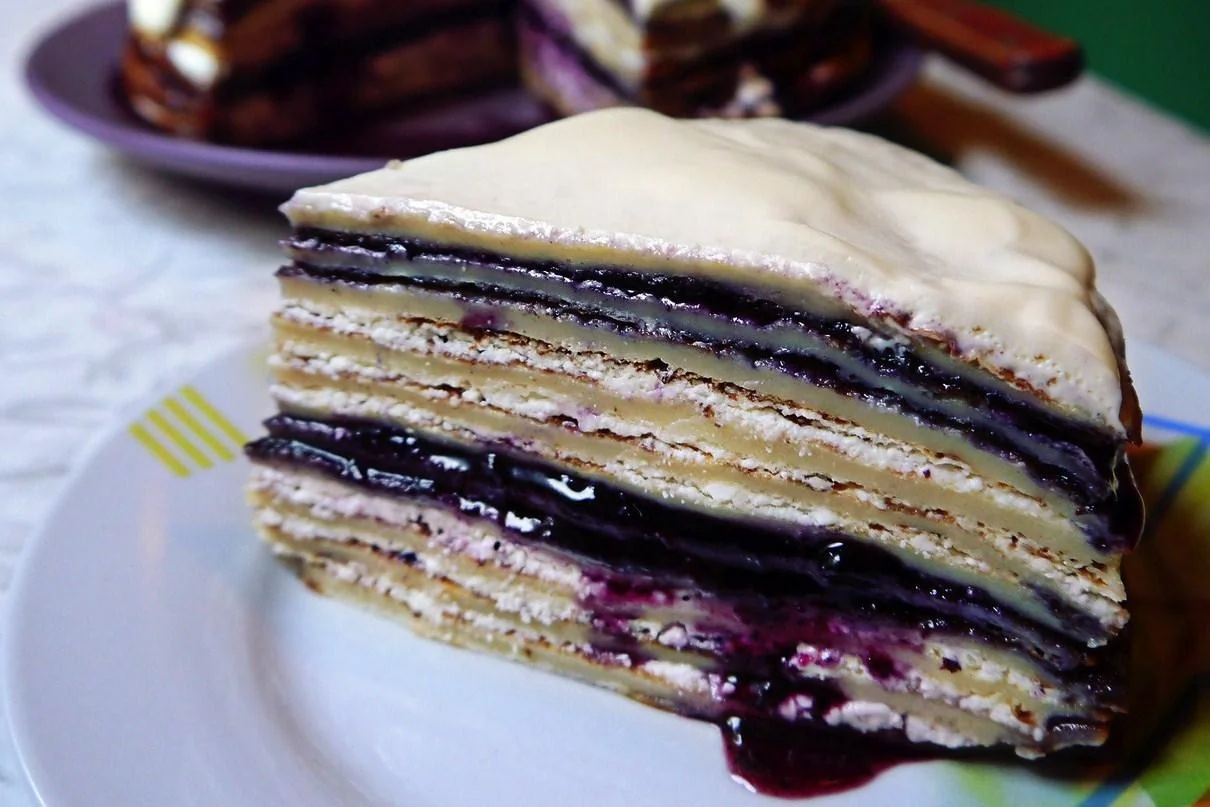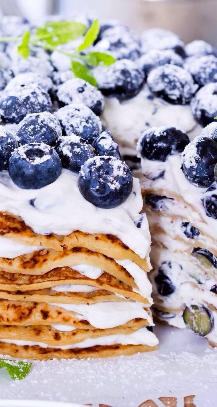 ШАГ 4 Собрать торт: 3 блина смазать кремом (каждый), 2 — черникой (каждый), 3 — кремом (каждый), 2 — черникой (каждый). Самый верхний блин обмазать оставленными взбитыми сливками.