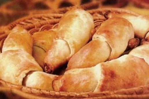 ШАГ 7 Вынуть из холодильника тесто, сначала 4 куска. Кусок помять в руках (чтобы подогрелся) и раскатать в виде тонкого блина, как на лапшу (чем тоньше — тем лучше!). Блин разрезать на 8 сегментов (как колесо) — получилось 8 треугольников. На край основания треугольника положить начинку, соединить широкие концы (концы основания), а потом скатать к узкому краю, вытягивая узкий край, как рогалик.
