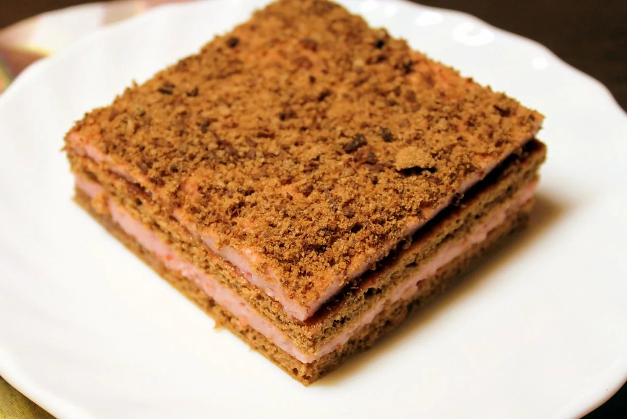 ШАГ 3 Бисквитные коржи пропитать сиропом. Выложить на 1 корж половину крема, накрыть вторым коржом, покрыть сверху оставшимся кремом, посыпать бисквитной крошкой. Поставить торт в холодильник минимум на 4 часа, до полного застывания крема. Готовый торт нарезать на пирожные.
