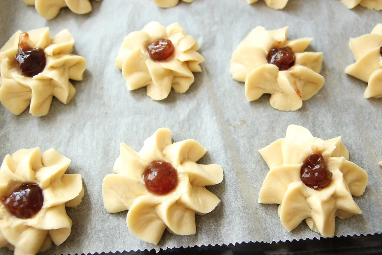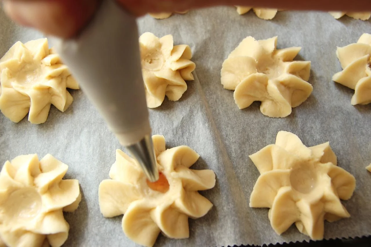 ШАГ 3 В центре печенья сделать пальцем углубление и из кондитерского мешка с насадкой (узкая трубочка) выдавить повидло.