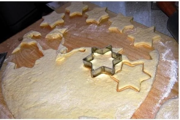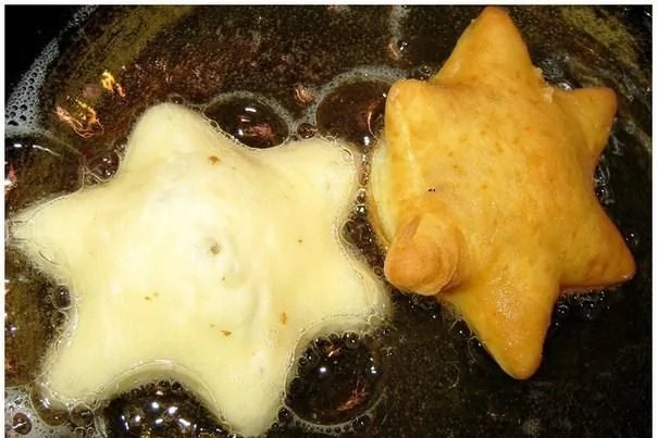 ШАГ 2 Раскатать не тонко (чуть меньше см), вырезать формочкой для печенья пышки и испечь в раскаленном растительном масле. Пышки на глазах раздуваются, пекутся молниеносно. В конце посыпать пудрой.
