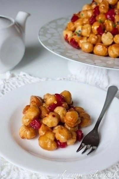 ШАГ 7 Перекладываем на блюдо горкой или в виде кольца, перемежая нарезанными цукатами. Украшаем цветной посыпкой. Даем струффоли застыть и подаем.