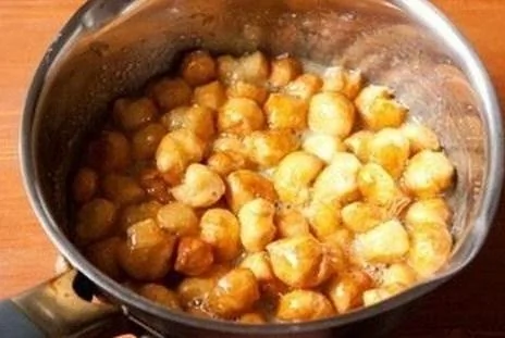 ШАГ 6 Готовим сироп. Мед и сахар кладем в небольшой ковшик и ставим на плиту. На среднем огне, помешивая, доводим до растворения сахара. Кладем шарики в сироп и перемешиваем.