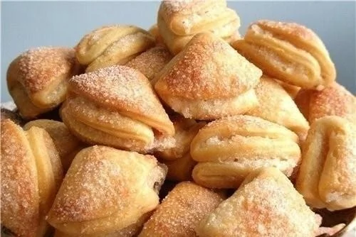 ШАГ 3 Каждый из кружочков теста обмакивается в сахар одной стороной, после чего складывается пополам таким образом, чтобы сахар оказался внутри. Этот полукруг опять одной стороной обмакивается в сахар, и складывается, как в предыдущий раз.