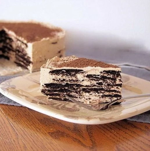 ШАГ 2 Теперь начните выкладывать десерт, выложив дно вафлями. Сверху нанесите слой крема. Продолжите выкладывать слои, чередуя вафли и крем. Последним слоем должен быть крем. Закройте форму пищевой пленкой и поставьте в холодильник минимум на 8 часов, лучше на ночь. Перед подачей присыпьте сверху какао через ситечко и снимите края с формы.