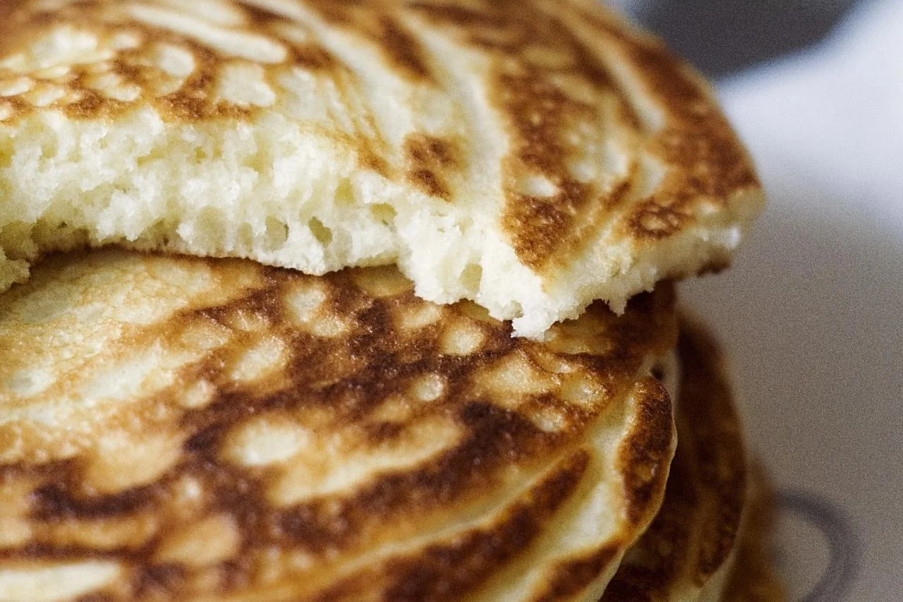 ШАГ 2 Для блинов яйца взбиваем с молоком и сахаром. В отдельную миску просеиваем муку с солью и разрыхлителем. Соединяем две смеси и замешиваем густое тесто. Вливаем растопленное масло и еще раз хорошо перемешиваем. Даем постоять 5 минут. Разогреваем сковороду на огне чуть ниже среднего, смазываем растительным маслом. Выливаем примерно 2 столовые ложки теста и слегка распределяем его в форме круга — слой тесто должен быть около 4 мм. Печем около 1–2 минут, затем переворачиваем и печем еще минуту.