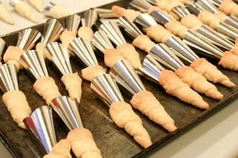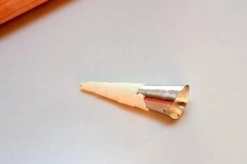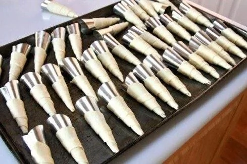 ШАГ 1 Духовку разогрейте до 200 градусов. Раскатайте лист теста, второй пока подержите в морозилке. Ножом для пиццы нарежьте тесто на 30 равных полосок. Закрутите каждую полоску вокруг формочки-конуса. Выставьте формочки с тестом на противень и выпекайте до золотисто-коричневого цвета 12 минут. Полностью остудите перед тем, как начинять кремом.