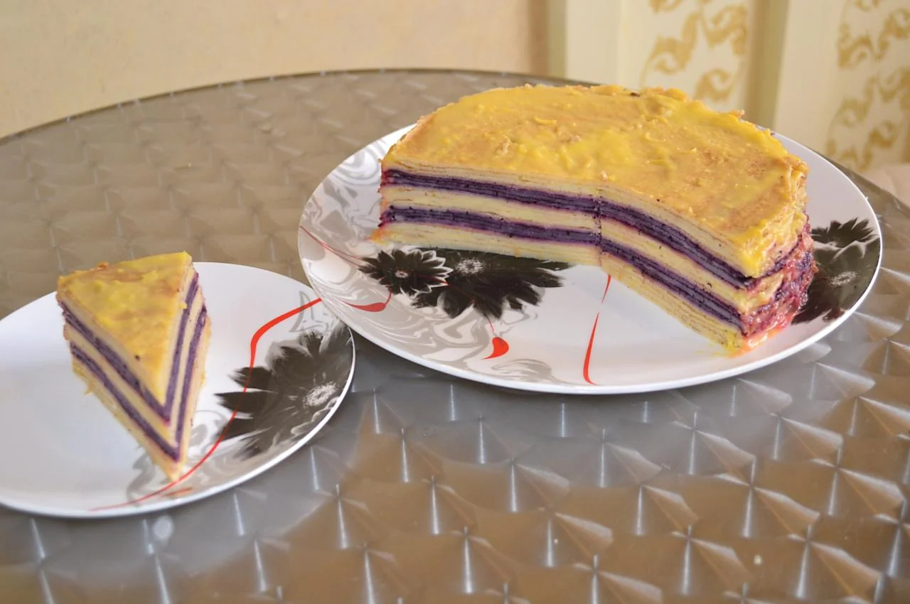 ШАГ 18 Первые 3–5 блина (в зависимости от их толщины) смазать лимонным курдом, последующие 3–5 блина — черничным джемом. Далее чередуем. Последний блин смазываем лимонным курдом, боковые стороны смесью курда и джема. Убрать в холодильник настояться. Подавать холодным к чаю.