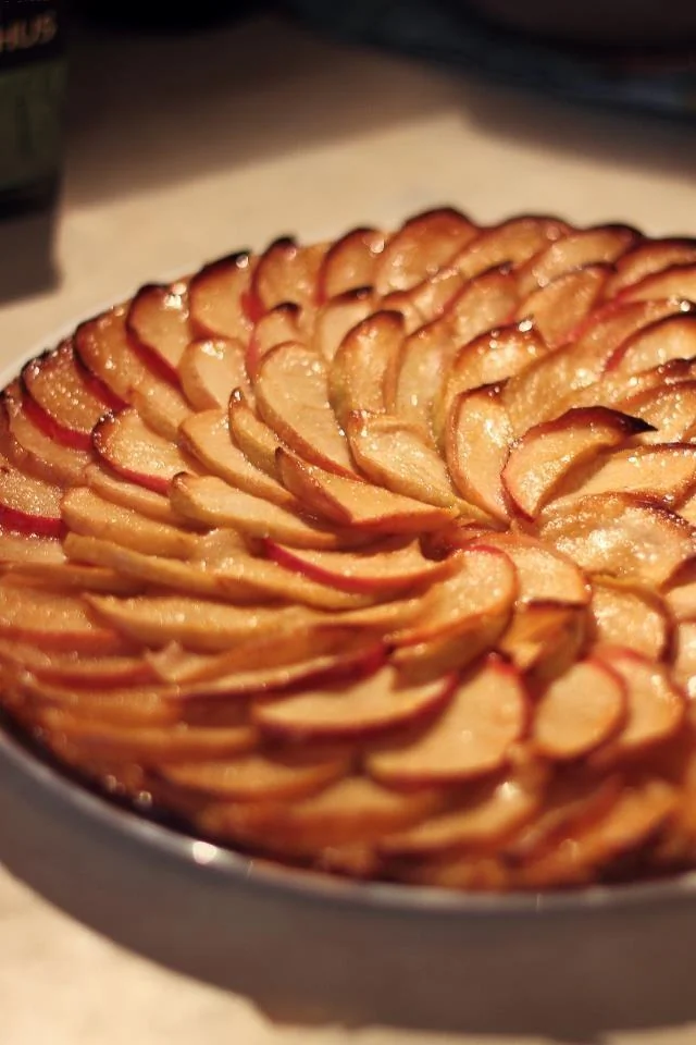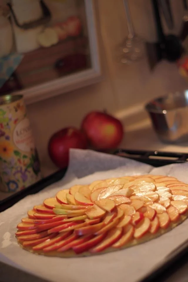 ШАГ 5 Нарезать тоненько яблоки на ломтики, выложить их веером по кругу и смазать их кистью масляно-сахарной смесью, но только аккуратно, так как можно сдвинуть яблоки. Посыпать 1 столовой ложкой сахарной пудры.