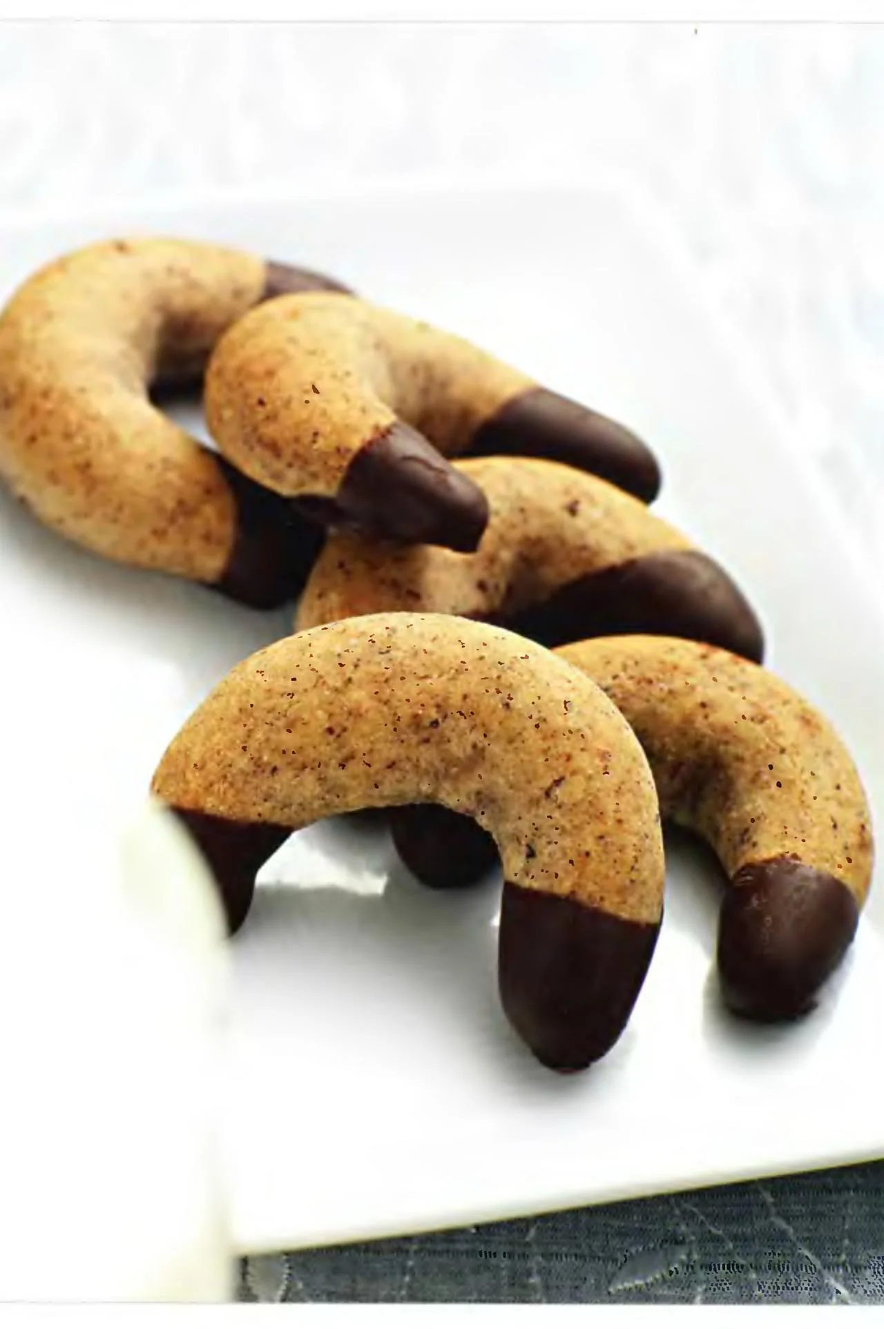 ШАГ 4 Растопить шоколад на водяной бане, слегка остудить. Подготовить решетку, постелив под нее бумажные полотенца или пленку. Окунать полумесяцы концами в растопленный шоколад и выкладывать на решетку, стараясь, чтобы шоколад как можно меньше касался поверхности. Поставить в холодильник и дать шоколаду застыть.