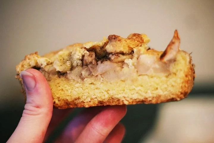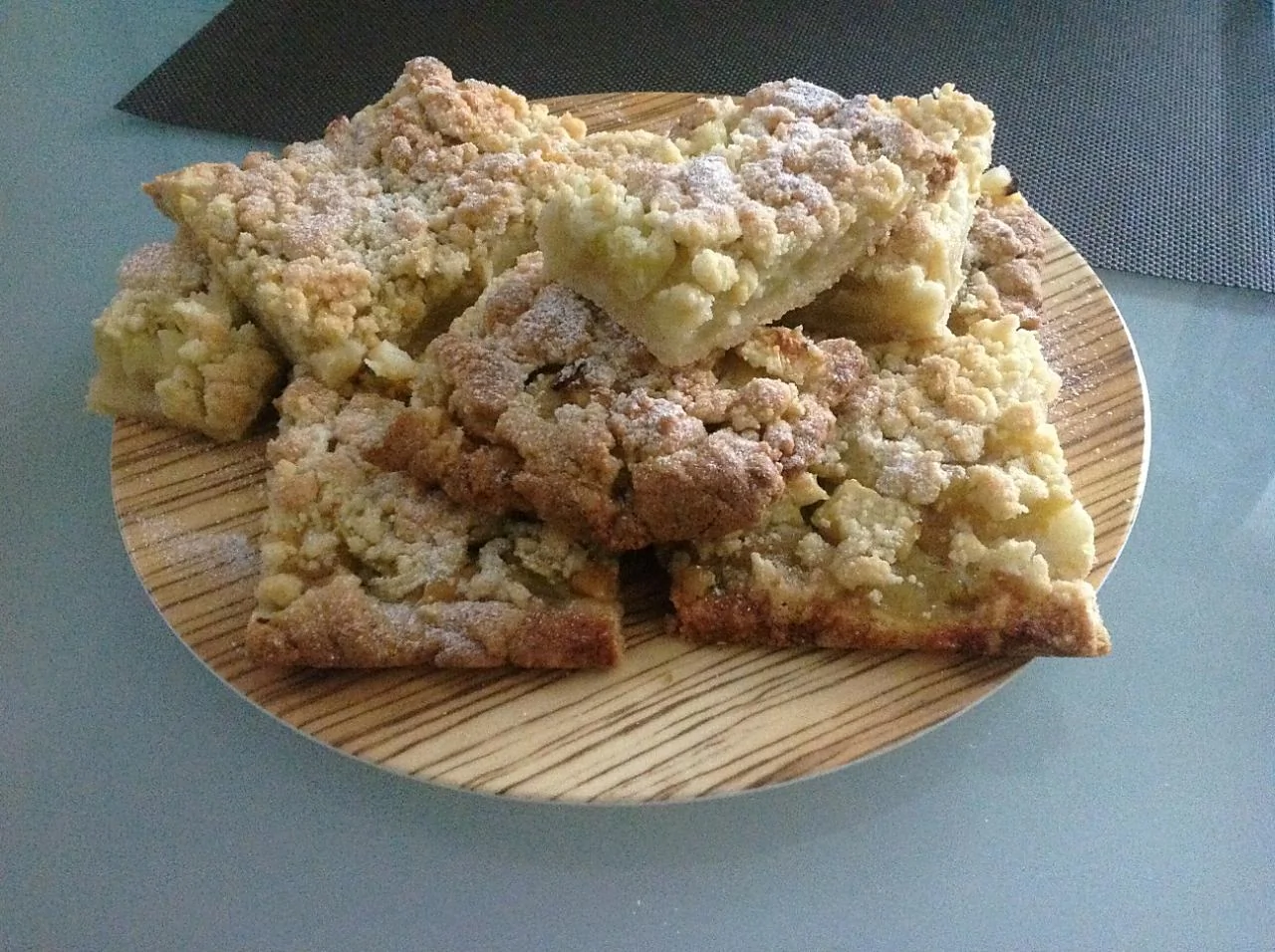 ШАГ 5 2/3 крошки переложить в смазанную маслом форму, выложить яблоки, посыпать корицей и сахаром, переложить оставшуюся крошку.
