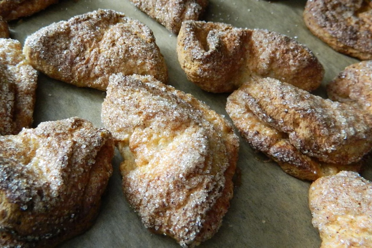 ШАГ 4 На тарелку насыпать сахар и корицу, перемешать. Обвалять кружок в сахаре, свернуть пополам, сахарной стороной вовнутрь.