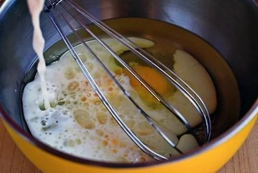 ШАГ 1 В одну миску залейте все мокрые ингредиенты: сок лимона, масло, молоко и яйца. Хорошенько их перемешайте.