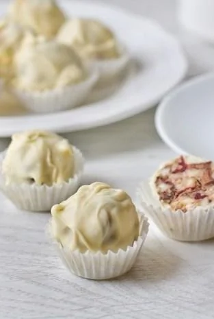 ШАГ 4 Тем временем, растапливаем на водяной бане или в микроволновке белый шоколад. Вынимаем шарики из морозилки и обмакиваем в шоколад. Кладем на пергамент и даем застыть.