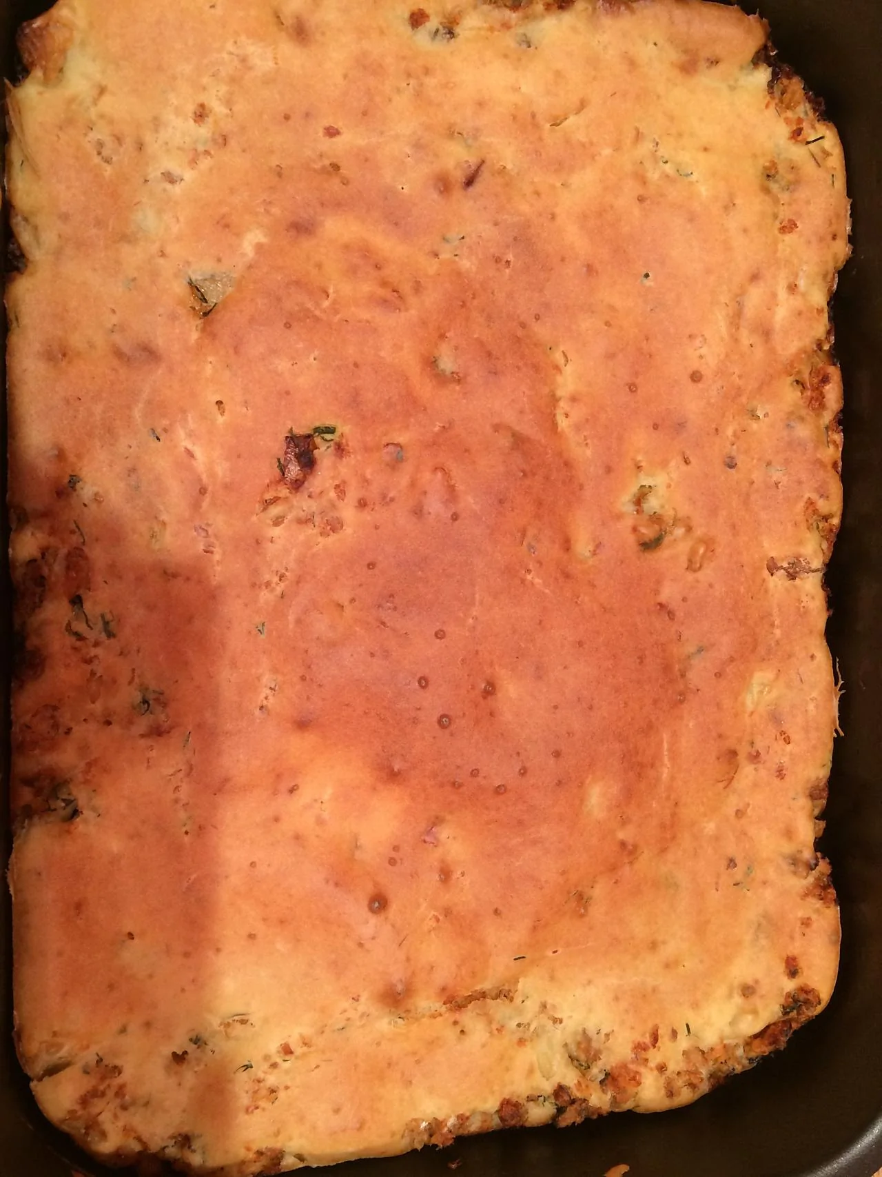 ШАГ 2 2/3 теста вылить в форму, предварительно положить фольгу и смазать растительным маслом. На тесто аккуратно выложить смесь из горбуши и лука. Сверху вылить остатки теста так, чтобы закрывало рыбу.