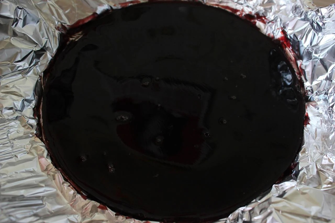 ШАГ 2 Вишневый сок подогрела, положила в него набухший желатин. Прогрела, пока он не распустится. Дно рамки торта обернула фольгой. Вылила остывший сок и охладила. Сняла рамку.
