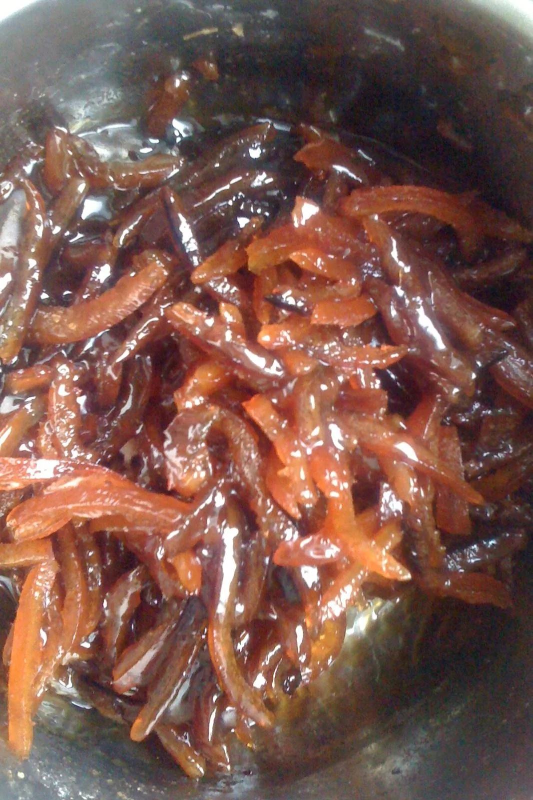 ШАГ 5 Когда сироп очень сильно загустеет и вывариться, и корки станут крепкие, леденцовые, темно-оранжевые, почти коричневые — снять их с огня.