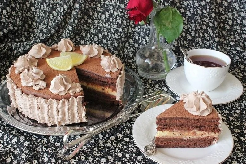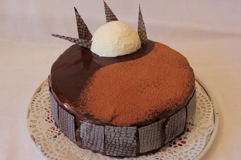 ШАГ 11 Утром вынуть торт из холодильника, снять рамку, выровнять торт горячим ножом. Присыпать какао порошком.