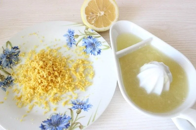 ШАГ 4 Для лимонного крема цедру мелко нарезать или натереть. Соединить ее с сахаром в сотейнике и пальцами перетереть так, чтобы сахар стал влажным и пропитался ароматом цедры. Добавить яйца (2 штуки) и лимонный сок.