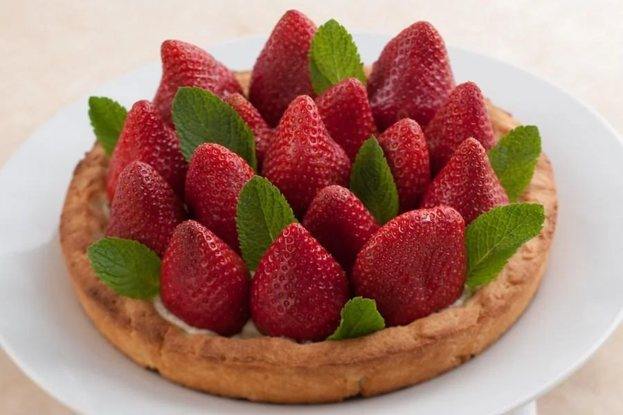ШАГ 7 Срежьте белую часть клубники, выложите крем в остывший корж, разровняйте его лопаткой, украсьте клубникой и листочками мяты и подавайте.