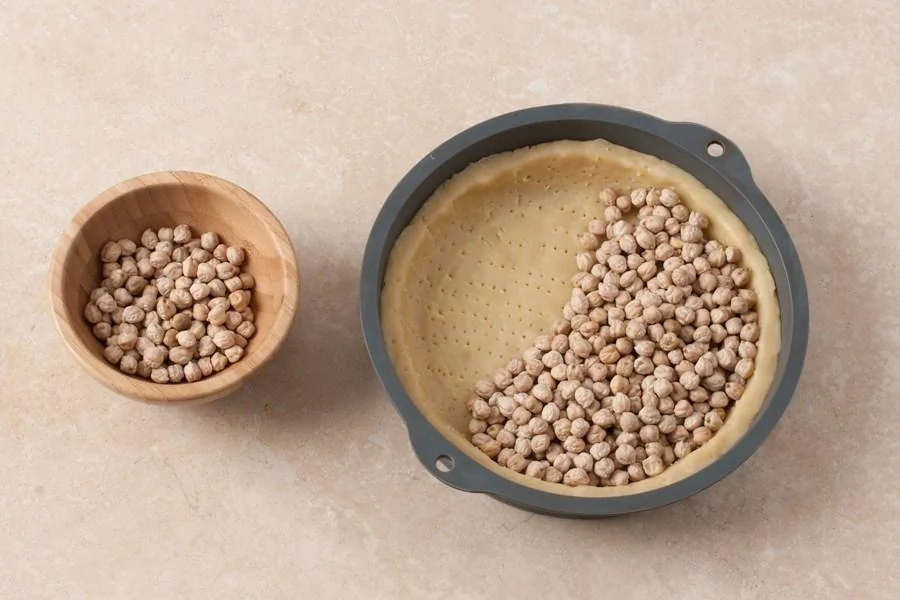 ШАГ 6 Распределите тесто по форме равномерным слоем в 0,5 см, сделайте бортики, вилкой проколите дно коржа по всей его площади и запекайте под грузом в разогретой до 200 градусов духовке в течение 20 минут; переложите корж в тарелку и дайте ему остыть в холодильнике 15 минут.