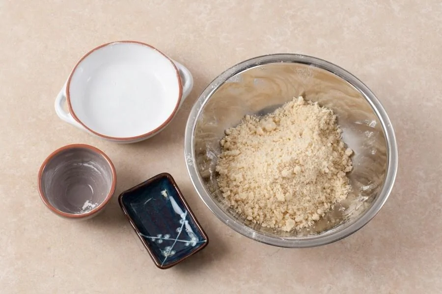 ШАГ 1 Замешайте большой пакет муки, сахарную пудру и большой кусок масла до состояния хлебных крошек.