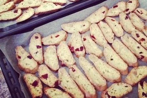 ШАГ 5 Вынуть, дать остыть и нарезать наискосок острым ножом ломтики толщиной 1 см, снова отправить в духовку минут на 10. Вынуть и дать остыть.