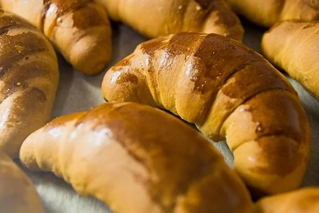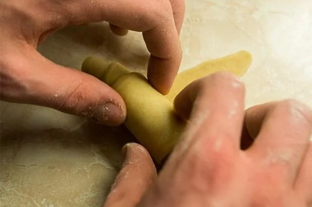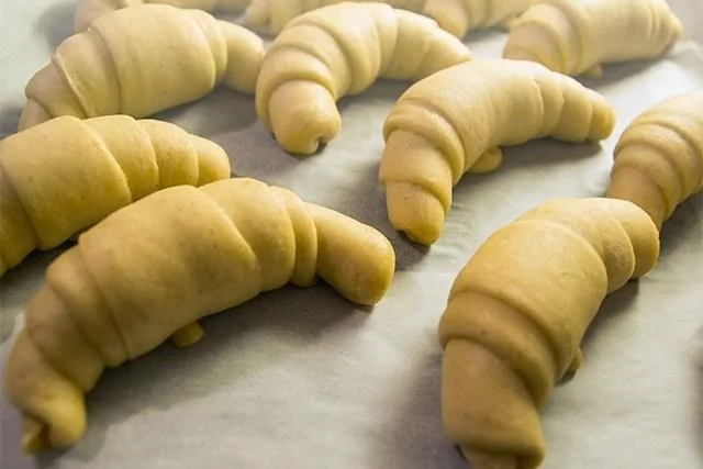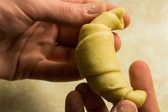 ШАГ 5 Каждый треугольник раскатать так, чтоб он получился как можно длиннее. Скрутить в рогалик, начиная с широкой части.