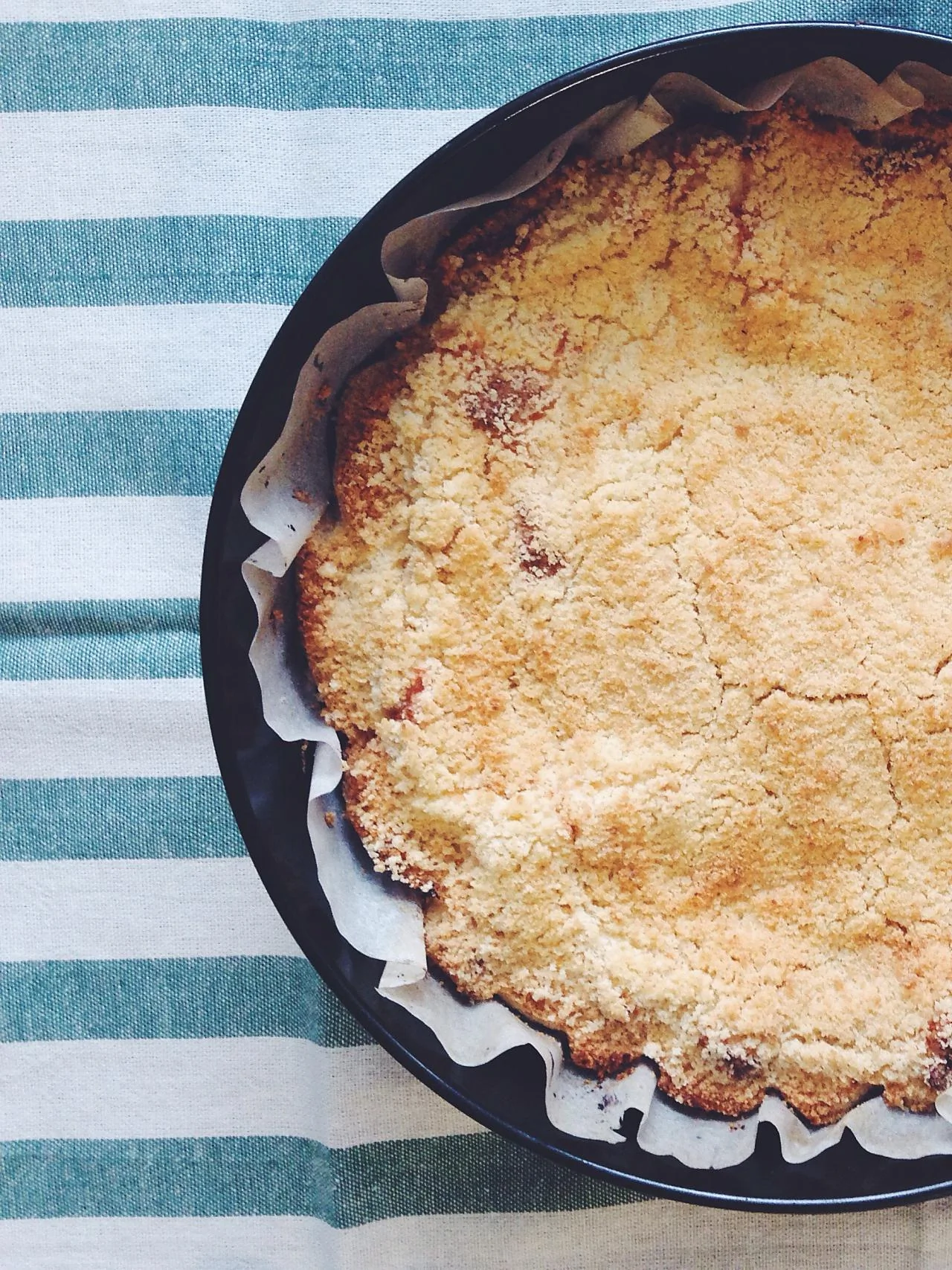 ШАГ 3 Форму покрыть бумагой для выпечки и немного смазать сливочным маслом. Выложить в форму половину теста. Выложить всю начинку и посыпать оставшимися крошками теста.