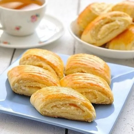 ШАГ 4 Тесто разделить на 4 части. Одну часть раскатать в прямоугольник толщиной 3 мм. Равномерно покрыть 1/4 части начинки в 3 мм. Закрутить в рулет. Намазать яичным желтком, нарезать на кусочки прямоугольной или треугольной формы и поставить в заранее разогретую духовку (180 градусов). Испечь до румяности. Также приготовить все остальное тесто.