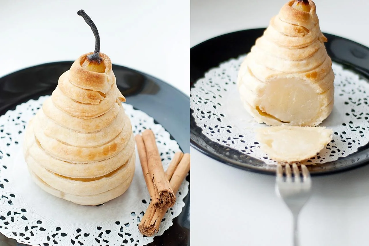 ШАГ 4 Подготовить тесто: раскатать его в прямоугольник и нарезать на полоски шириной 0,5 см. Обернуть полосками груши и отправить в духовку на 25–30 минут выпекаться до золотистого цвета теста при температуре 180 градусов.