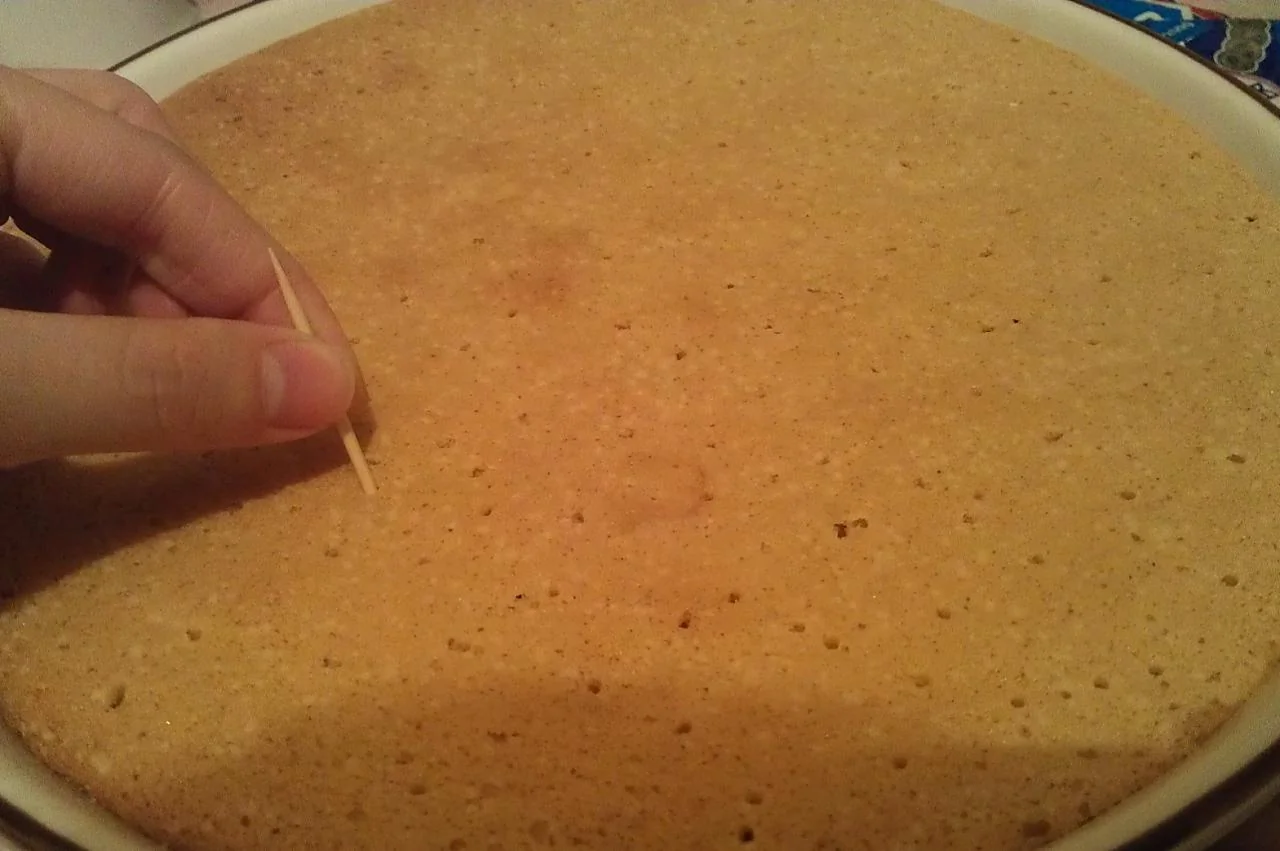 ШАГ 2 Для заливки сгущенное молоко перемешать со сливками. После того, как пирог поднялся и немного остыл, проколоть в нем дырочки (я делала зубочистками) по всей поверхности — это необходимо для заливки. Далее пропитать пирог (я не вынимаю его из формы, прям в ней и пропитываю, выливая ложкой по всей поверхности).