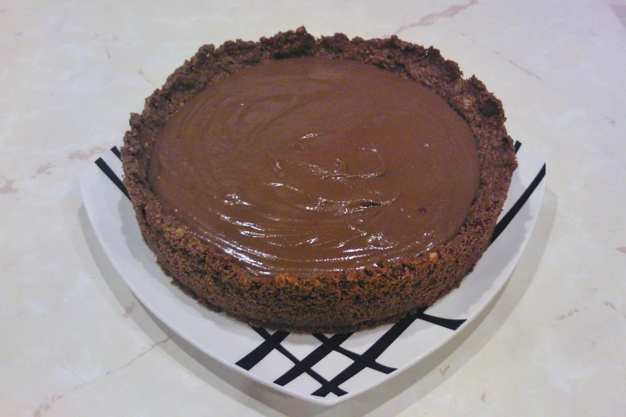 ШАГ 5 По истечении указанного времени можно освободить основу пая от формы, в которой мы его до настоящего момента держали. И заполнить получившийся корж шоколадным кремом.