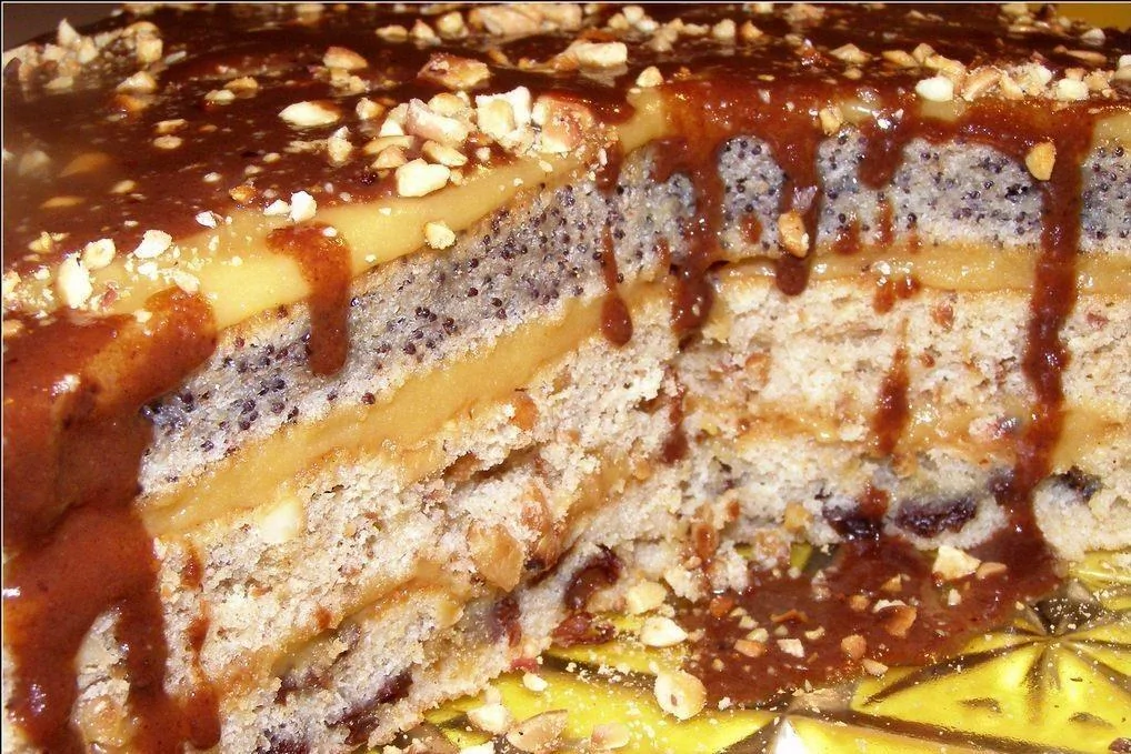 ШАГ 7 Готовые коржи уложить друг на друга, смазывая кремом, в следующем порядке: корж с орехами, корж с маком, корж с изюмом.