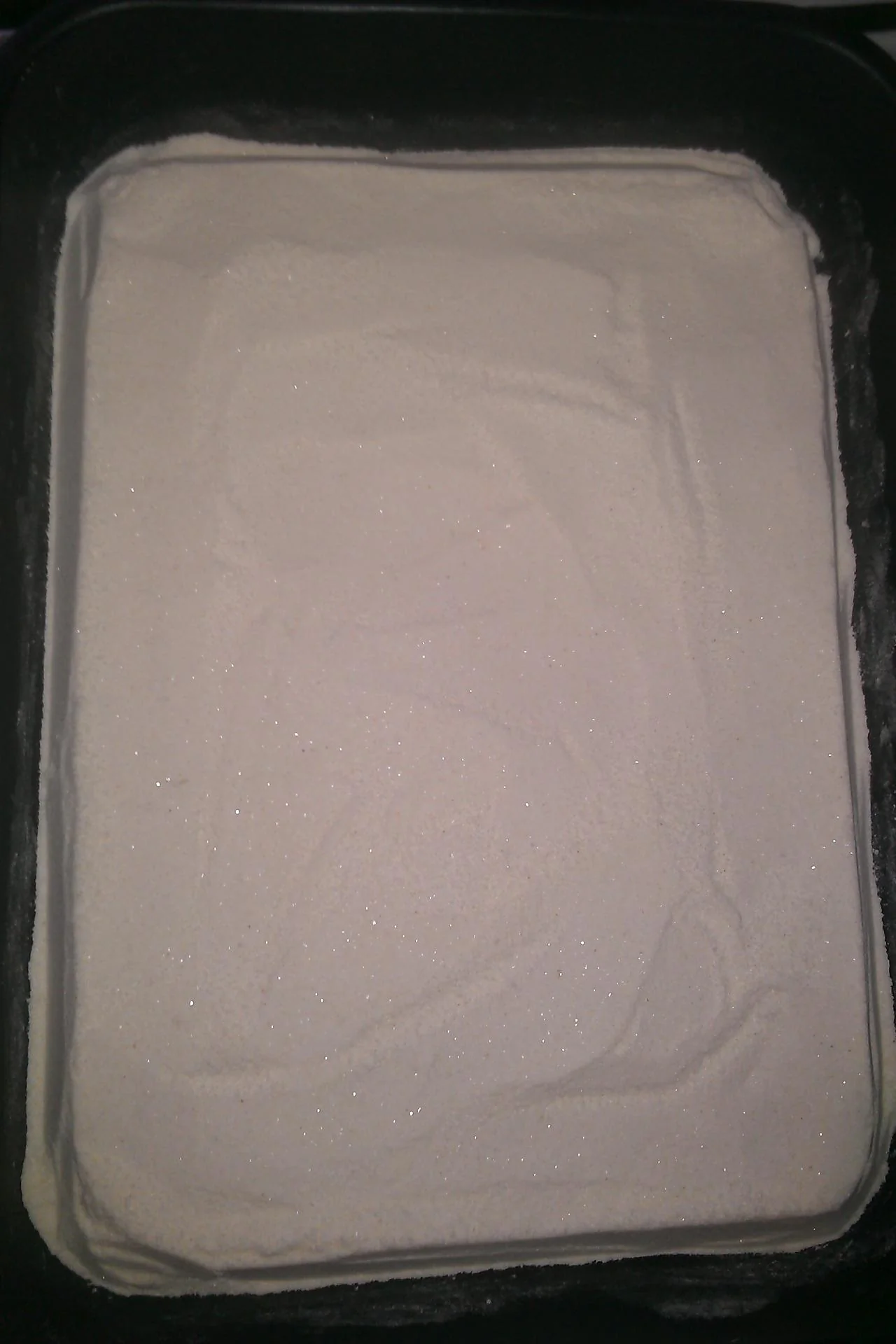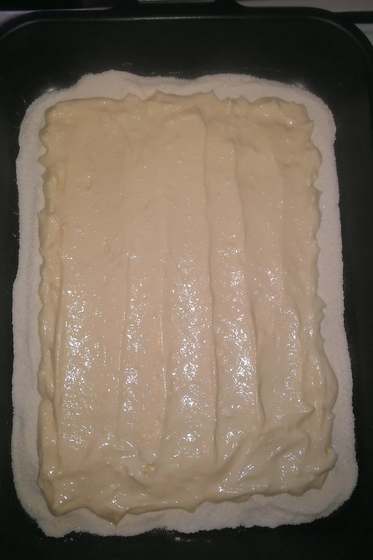 ШАГ 3 Берем форму для выпечки (у меня прямоугольной формы). Все выкладываем слоями: первый слой — насыпное тесто, затем выкладываем творожную массу, снова — тесто, массу и последний слой теста. Далее нарезаем сливочное масло, равномерно по всей поверхности пирога.