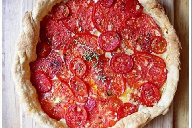 ШАГ 4 Охлажденное тесто выложите на стол, посыпанный мукой. Раскатайте в круг. На середину раскрошите брынзу и выложите помидоры. Сверху — тимьян.